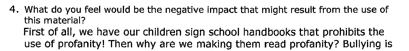 The language was not simply shocking in isolation but demonstrated that the book was anti-Christian. The use of “Christ” and “goddam” demonstrated this. By juxtaposing this against the supposed protection for Islam, the challenger invokes the myth of an anti-Christian turn in American society. This is necessarily unfair and religious persecution. Of course, the challenger would go on to make clear that a censored version of Fahrenheit 451 would be ok if it was “able to relate biblical on how to deal with some of the tough issues.” This would be impossible because “we cannot bring religious thoughts into public schools.” The supposed persecution prevented any proper use of the book that was itself anti-Christian and, thus, the only reasonable use is to remove it.